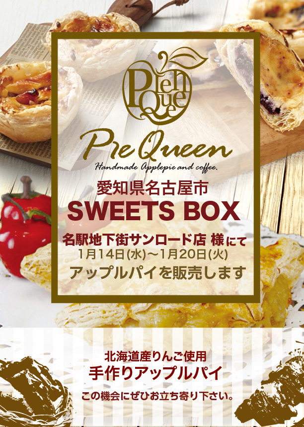 ◆ SWEETS BOX名駅地下街サンロード店様にてアップルパイを販売します 日時: 2026年01月14日~2026年01月20日 場所:愛知県名古屋市中区錦3丁目25 ◆ 中テレ祭り2025にてアップルパイを販売します 日時: 2025年12月05日~2025年12月07日 場所:福島県郡山市南2丁目52-52 ビッグパレットふくしま3階 ◆ JR仙台駅2Fステンドグラス前にてアップルパイを販売します 日時: 2025年12月09日~2025年12月16日 場所:宮城県仙台市青葉区中央1丁目1-1 ◆ 大船ルミネウィング様にてアップルパイを販売します 日時: 2025年12月14日~2025年12月25日 場所:神奈川県鎌倉市大船1丁目4-1 JR大船駅 南改札口正面 ◆ イオン新さっぽろ店様にてアップルパイを販売します 日時: 2025年12月26日~2025年12月31日 場所:北海道札幌市厚別区厚別中央2条5丁目7-1 ◆ チ・カ・ホ札幌駅前通り地下広場にてアップルパイを販売します 日時: 2025年12月17日~2025年12月17日 場所:北海道札幌市中央区 札幌駅前地下歩行空間 ◆ きたキッチンオーロラタウン店様にてアップルパイを販売します 日時: 2025年12月10日~2025年12月16日 場所:北海道札幌市中央区大通西2丁目 さっぽろ地下街オーロラタウン ◆ スーパーアークス北24条店様にてアップルパイを販売します 日時: 2025年12月12日~2025年12月14日 場所:北海道札幌市北区北24条西9丁目1-1 ◆ チ・カ・ホ札幌駅前通り地下広場にてアップルパイを販売します 日時: 2025年12月08日~2025年12月09日 場所:北海道札幌市中央区 札幌駅前地下歩行空間 ◆ イオン江別店様にてアップルパイを販売します 日時: 2025年12月06日~2025年12月09日 場所:北海道江別市幸町35番地 ◆ ラルズマート啓明店様にてアップルパイを販売します 日時: 2025年11月17日~2025年11月20日 場所:北海道札幌市中央区南11条西21丁目4-21 ◆ イオン札幌手稲駅前店様にてアップルパイを販売します 日時: 2025年11月18日~2025年11月23日 場所:北海道札幌市手稲区前田1条11丁目1-1 ◆ イオンスーパーセンター石狩緑園台店様にてアップルパイを販売します 日時: 2025年10月30日~2025年11月04日 場所:北海道石狩市緑苑台中央1丁目2 ◆ スーパーアークス宮の沢店様にてアップルパイを販売します 日時: 2025年11月11日~2025年11月13日 場所:北海道札幌市手稲区西宮の沢5条2丁目11-20 ◆ スーパーアークス北24条店様にてアップルパイを販売します 日時: 2025年11月07日~2025年11月09日 場所:北海道札幌市北区北24条西9丁目1-1 ◆ 北海道どさんこプラザ 札幌店様にてアップルパイを販売します 日時: 2025年11月19日~2025年11月25日 場所:北海道札幌市北区北6条西4丁目 ◆ あみプレミアム・アウトレット様にてアップルパイを販売します 日時: 2025年11月21日~2025年11月30日 場所:茨城県稲敷郡阿見町よしわら4丁目1-1 ◆ グランデュオ立川様にてアップルパイを販売します 日時: 2025年11月12日~2025年11月18日 場所:東京都立川市柴崎町3丁目2-1 ◆ 八木橋百貨店様にてアップルパイを販売します 日時: 2025年11月06日~2025年11月11日 場所:埼玉県熊谷市仲町74 ◆ スーパーアークス星置店様にてアップルパイを販売します 日時: 2025年10月08日~2025年10月10日 場所:北海道札幌市手稲区手稲山口478-1 ◆ イオン石狩緑苑台店様にてアップルパイを販売します 日時: 2025年10月30日~2025年11月04日 場所:北海道石狩市緑苑台中央1丁目2 ◆ ビッグハウス エクストラ店様にてアップルパイを販売します 日時: 2025年10月15日~2025年10月10日 場所:北海道札幌市豊平区平岸1条22丁目2-15 ◆ イオン東札幌店様にてアップルパイを販売します 日時: 2025年10月02日~2025年10月07日 場所:北海道札幌市白石区東札幌3条2丁目1 ◆ イオン岩見沢店様にてアップルパイを販売します 日時: 2025年10月16日~2025年10月21日 場所:北海道岩見沢市大和4条8丁目1 ◆ イオン札幌藻岩店様にてアップルパイを販売します 日時: 2025年10月09日~2025年10月14日 場所:北海道札幌市南区川沿2条2丁目1-1 ◆ きたキッチンオーロラタウン店様にてアップルパイを販売します 日時: 2025年10月22日~2025年10月28日 場所:北海道札幌市中央区大通西2丁目 さっぽろ地下街オーロラタウン ◆ チ・カ・ホ札幌駅前通り地下広場にてアップルパイを販売します 日時: 2025年10月29日~2025年10月29日 場所:北海道札幌市中央区 札幌駅前地下歩行空間 ◆ ココノ ススキノ様にてアップルパイを販売します 日時: 2025年10月31日~2025年10月31日 場所:北海道札幌市中央区南4条西4丁目1-1 ◆ くるるの杜様にてアップルパイを販売します 日時: 2025年10月12日~2025年10月13日 場所:北海道北広島市大曲377-1 ◆ nonowa武蔵小金井様にてアップルパイを販売します 日時: 2025年10月27日~2025年11月05日 場所:東京都小金井市本町6丁目 ◆ 東武百貨店船橋店様にてアップルパイを販売します 日時: 2025年10月09日~2025年10月15日 場所:千葉県船橋市本町7-1-1 ◆ SWEETS BOX西武高田馬場店様にてアップルパイを販売します 日時: 2025年10月07日~2025年10月13日 場所:東京都新宿区高田馬場1丁目35-2 高田馬場駅 ◆ 近鉄百貨店橿原店様にてアップルパイを販売します 日時: 2025年10月15日~2025年10月21日 場所:奈良県橿原市北八木町3丁目65-11 ◆ そごう大宮店様